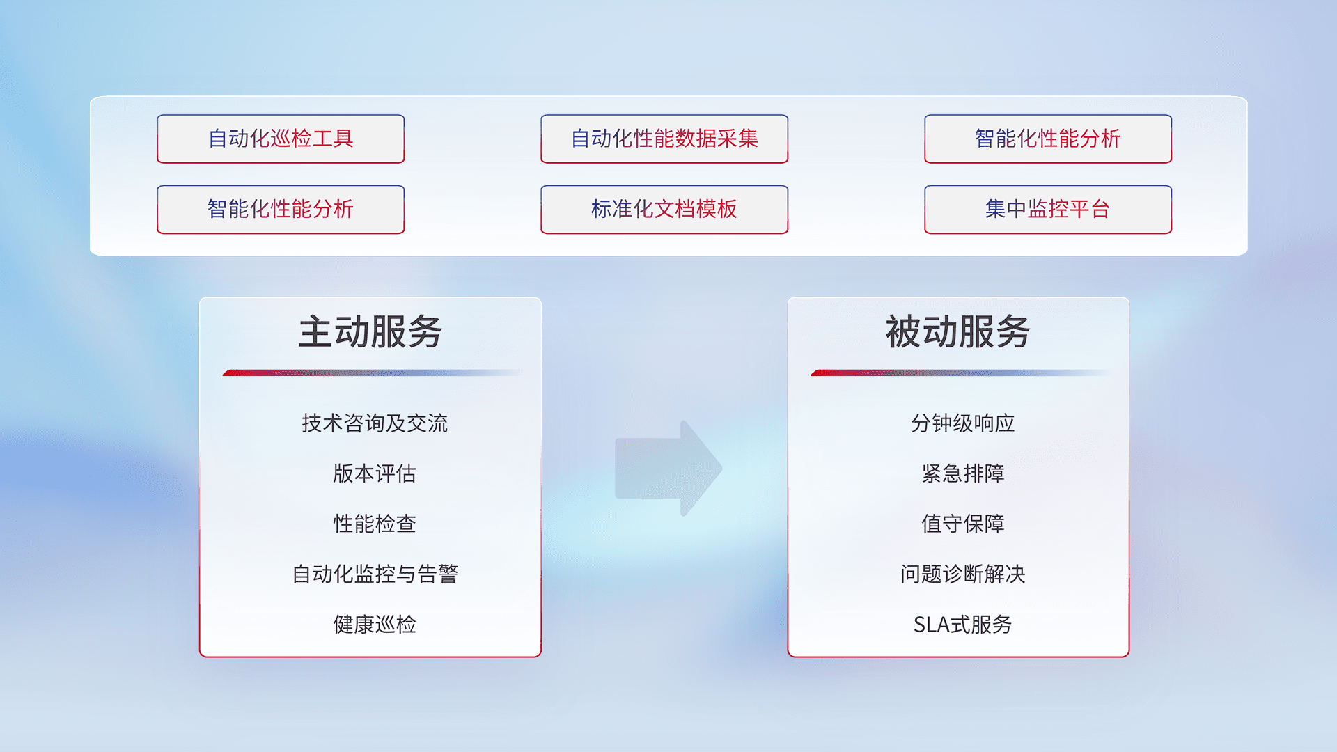 智能化工具和标准化文档,,,,保障服务质量,,,,提供主动服务(包含技术咨询、、、、版本评估、、、、性能检查、、自动化监控与告警、、健康巡检)和被动服务包含(分钟级响应、、、紧急排障、、值守保障、、、问题诊断解决、、SLA服务)。。